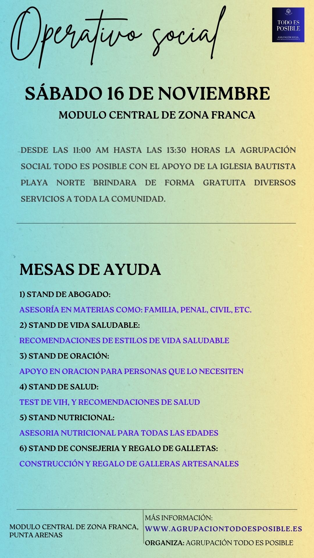 La Agrupación social "Todo es Posible", con el apoyo de la iglesia bautista de playa norte y la iglesia Alianza Cristiana y Misionera, llevará a cabo un operativo social gratuito para toda la comunidad.